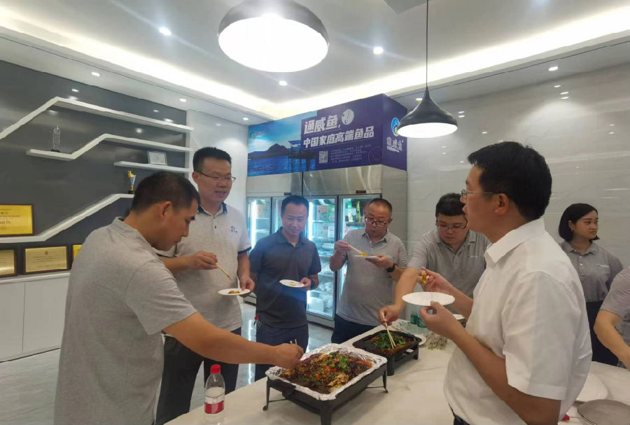 來賓一行首先前往新津到通威(成都)水産加工廠參觀,并對公司産品進行品鑒。莫董團隊對通威食品旗下的鮰魚烤魚、調理鲈魚、脆羅非魚片、烏魚片、蝦滑、魚丸等産品品質、口感贊不絕口。