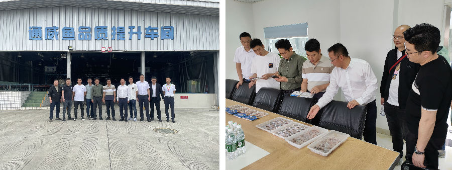 來賓一行在通威魚殷勇總經理的陪同下先後參觀了新津通威農博園、通威(成都)水産食品有限公司、通威魚園區基地、TIC國際中心,詳細了解了通威食品加工廠标準化加工流程和檢測流程,并對産品進行品鑒。