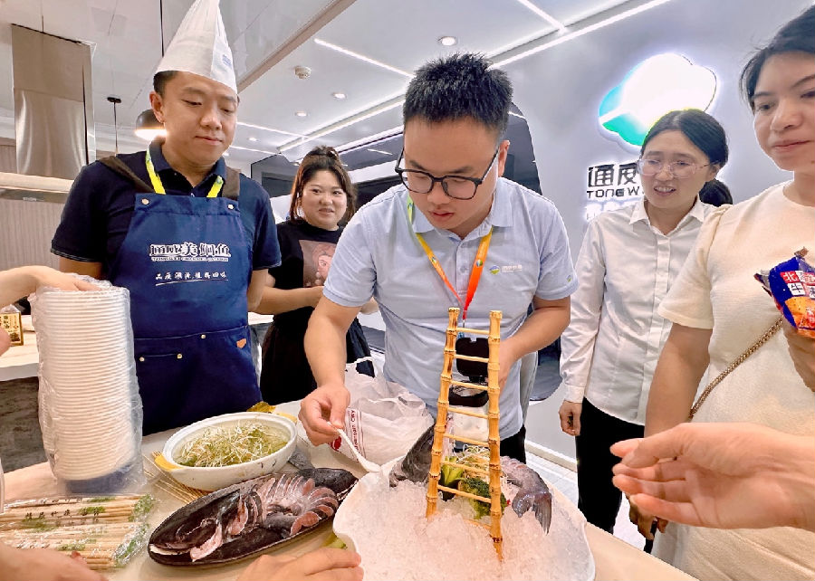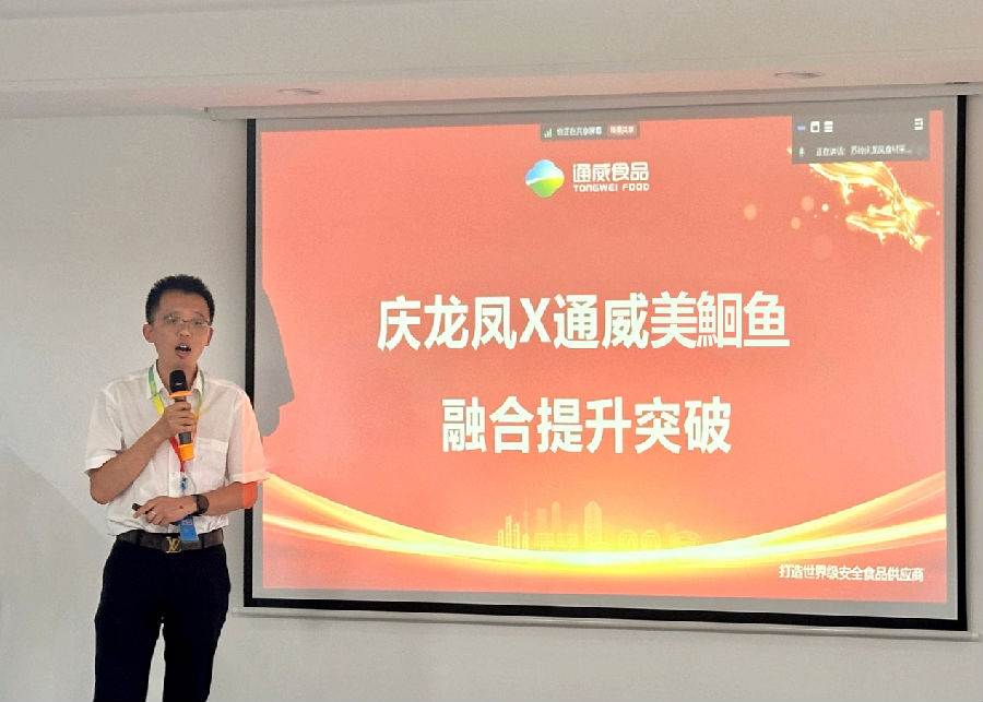随後,通威美鮰魚經銷渠道負責人從合作開發目标、保障措施兩方面作詳細部署;通威美鮰魚應用研發則從推廣角度,帶來了一場鮰魚擺盤知識分享。