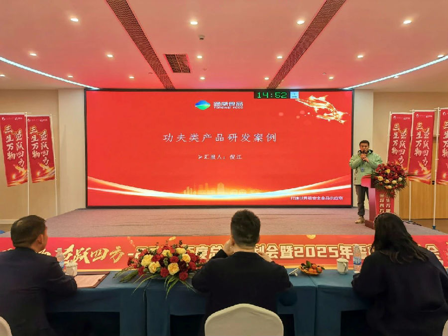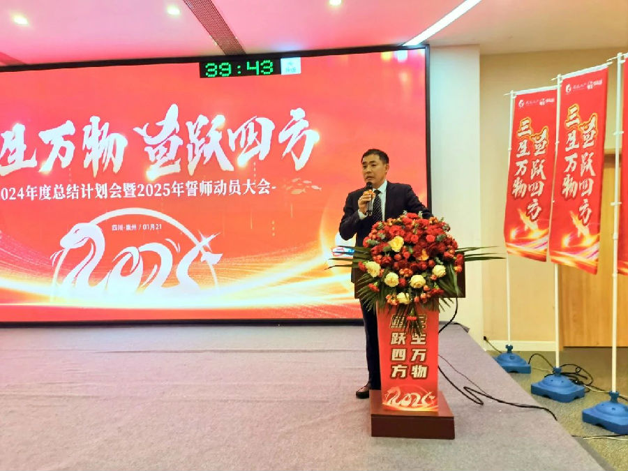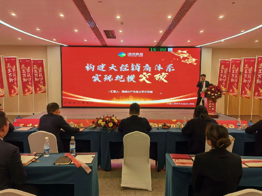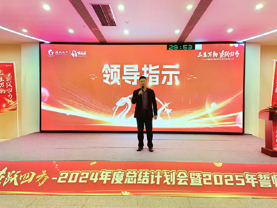 2025年1月21日,通威食品三魚闆塊“三生萬物·魚躍四方”2024年總結與2025年計劃會暨誓師動員大會在崇州隆重舉行。通威食品總經理陳波、通威食品副總經理薛峰、通威食品總經理助理王珊,通威水産和萊克内銷全體幹部員工齊聚一堂,共襄盛會。