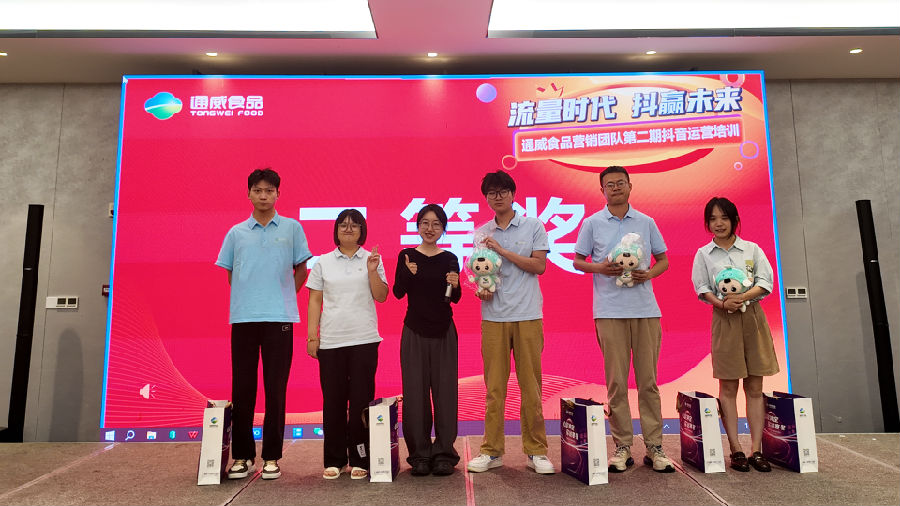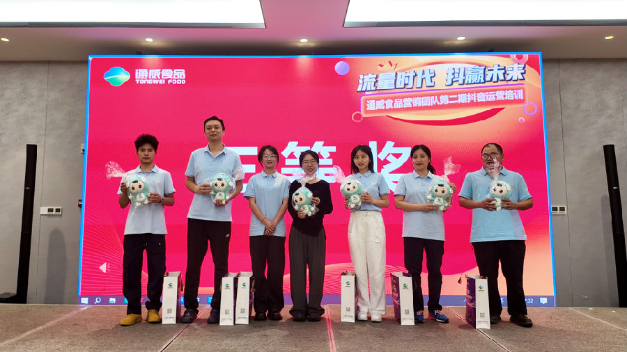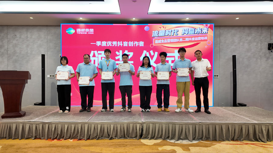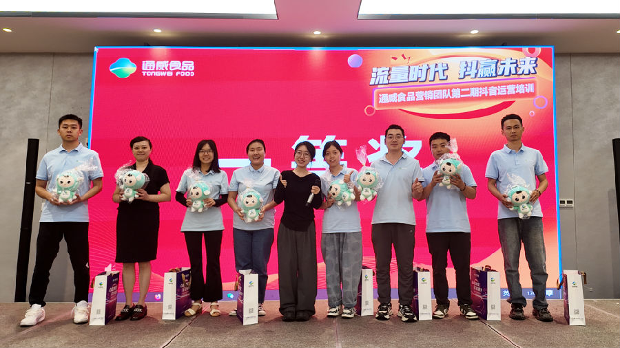 培訓開始前,根據營銷人員在2025年一季度抖音發布數量、咨詢數量、實際轉化銷量,評選出10名“優秀抖音創作者”,通威食品副總經理薛峰對獲獎人員進行現場頒獎。
