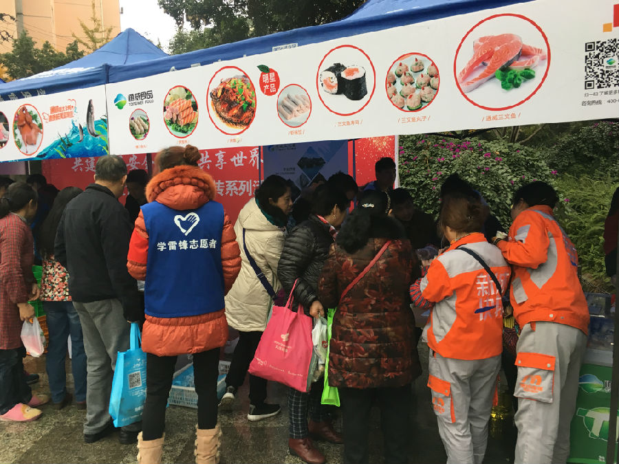 此次社區行活動有成都新太豐農業開發有限公司、通威(成都)三文魚有限公司、通威(成都)水産食品有限公司、成都春源食品有限公司4家公司參與。各公司将各自新品及熱銷産品帶到了活動現場,供市民試吃和購買。