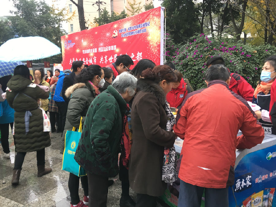 通威食品在武侯區一處人流密集的小遊園廣場進行了本次食品安全社區行活動,雖天公不作美但到場參加活動的市民熱情不減,活動場地還在搭建之時就有大量市民前來圍觀了解、購買。