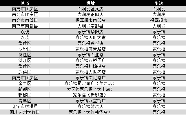 新北店、紅旗雙城三路店、藍草路店、四道街店、建興店、萬達店、天鵝路店、大華店、紅旗天益南巷分場、時時果蔬榮華南路店、南城都會店、橡樹林店、紅旗會展店、時時果蔬、燈山路店、積步街店、沙堰街店、科聯路店、紅旗久居福店、萬達二店、紅旗東五段店、時時果蔬恒大名都店、時時果蔬海昌店、長順街店、紅旗肖家河店、興元麗都店、家園店、金祥路店、翡翠城店、恒大綠洲店、清水路苑店、君平店、元華二巷店、兆景路店、大源北支路店、武城大街店