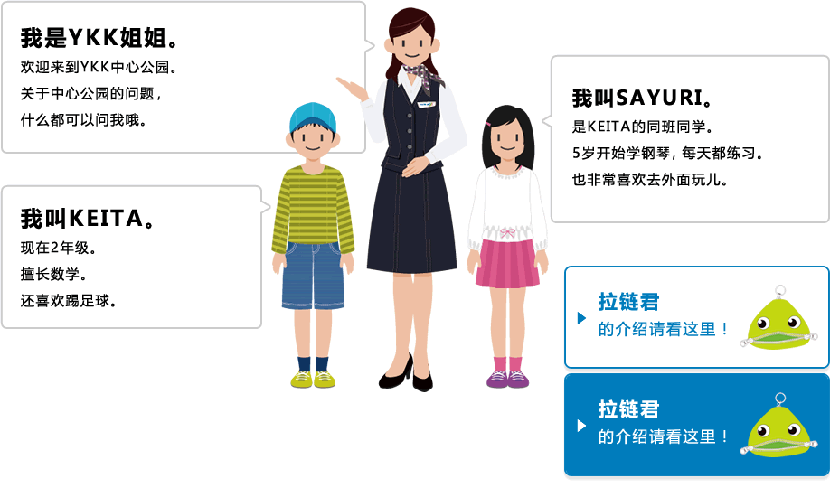 我是YKK姐姐。 欢迎来到YKK中心公园。 关于中心公园的问题,什么都可以问我哦。
