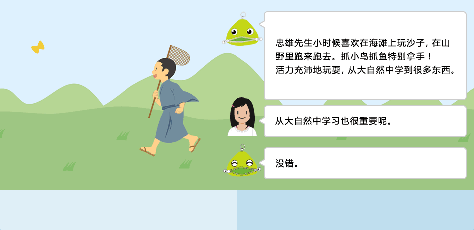 忠雄先生小时候喜欢在海滩上玩沙子,在山野里跑来跑去。抓小鸟抓鱼特别拿手! 活力充沛地玩耍,从大自然中学到很多东西。
