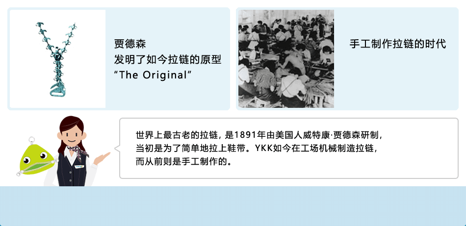 世界上最古老的拉链,是1891年 由美国人威特康·贾德森研制,当初是为了简单地拉上鞋带。YKK如今在工场机械制造拉链,而从前则是手工制作的。