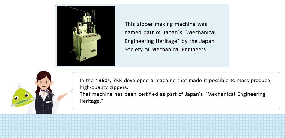 This zipper making machine was named part of Japan's "Mechanical Engineering Heritage" by the Japan Society of Mechanical Engineers.
