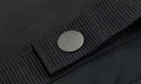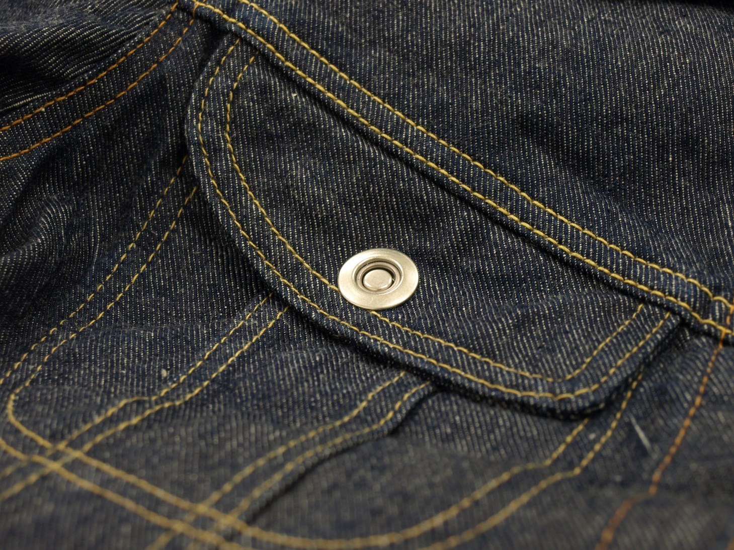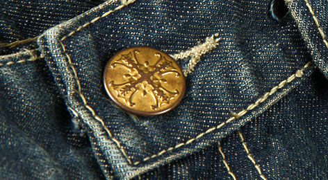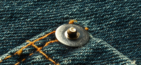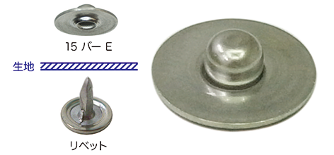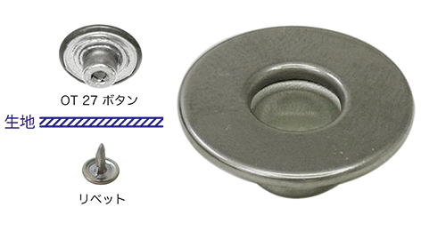 主にデニム製品(ジーンズ)の前立に使われています。ボタンとタックの二つのパーツで構成され、生地の裏側からタック(又はリベット)を打ち込んで取付けます。糸切れによるボタン紛失の心配がありません。