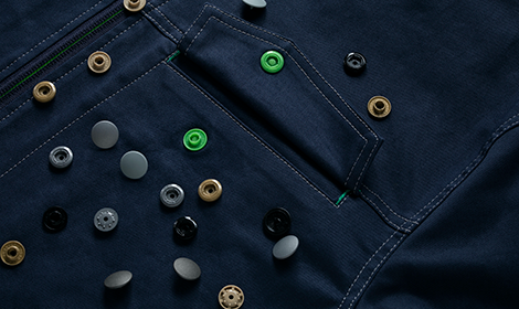 YKKでは、スナップ&ボタンなど点と点で繋ぐファスニング商品も作っています。