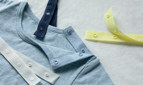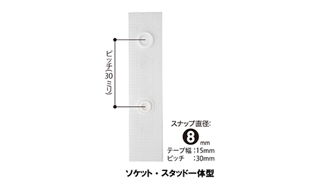 テープに樹脂製のソケットとスタッドを射出してあり、縫製だけで御使用頂けるのでスナップの取付けミスがありません。脱着感がソフトであること、凹凸が少ないことなどから、ベビー・キッズ以外にもユニバーサルデザイン向け素材としても適しております。