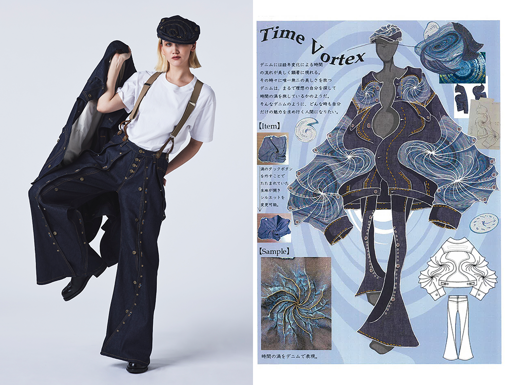 デニムには経年変化による時間の流れが美しく顕著に現れる。その時々に唯一無二の美しさを放つデニムは、まるで理想の自分を探して時間の渦を旅しているかのよう。そんなデニムのようにどんな時も自分だけの魅力を求め行く人間になりたいという思いを込めて制作した。 |
