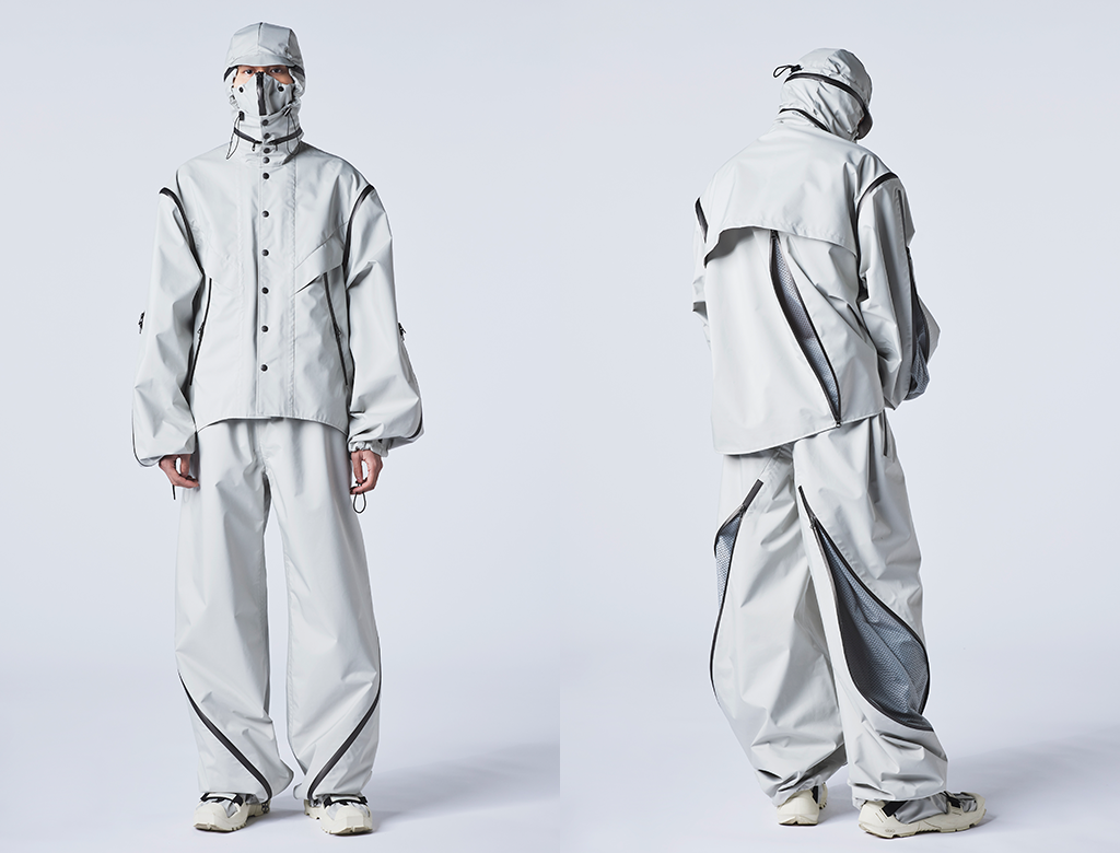 ![]() シンプルに見えますがパターンにこだわり、何度もトワルを組んでシルエットを調整しました。ポケットや袖、パンツの螺旋状の切替などディティールのパターンには特にこだわっています。中でも、顔にフィットする立体のパターンが必要なヘッドパーツの制作や裏地の縫製に苦労しましたが、自分の作品に愛情があるので乗り越えられました。 AquaGuard®ファスナーを閉めると防水機能を高め、開くと内側のメッシュ素材を通して通気性が良くなるようデザインしました。ジャケットの前立てのファスナーを閉め、さらにその上からPLANCER®をとめることでよりプロテクト機能を高めています。帽子、袖、パンツの裾に取り付けたアイレットワッシャーにゴム紐を通して閉めるとバルーンシルエットになり、活動性を高めています。靴は普段つくっていませんが、デザイン画のデザインを忠実に実現できるように似た商品を探し出し、リメイクしました。 洋服をデザインするときには機能性を一番大事にしています。自分の生活や経験の中で「こうだったらいいのに」と思ったところからデザインを考えています。今回のコンテストで自分のデザインに自信を持つことができたので、自分のデザインを信じて時代の流れをよく読んで、世の中にファッションを通してメッセージを発信していきたいです。 |