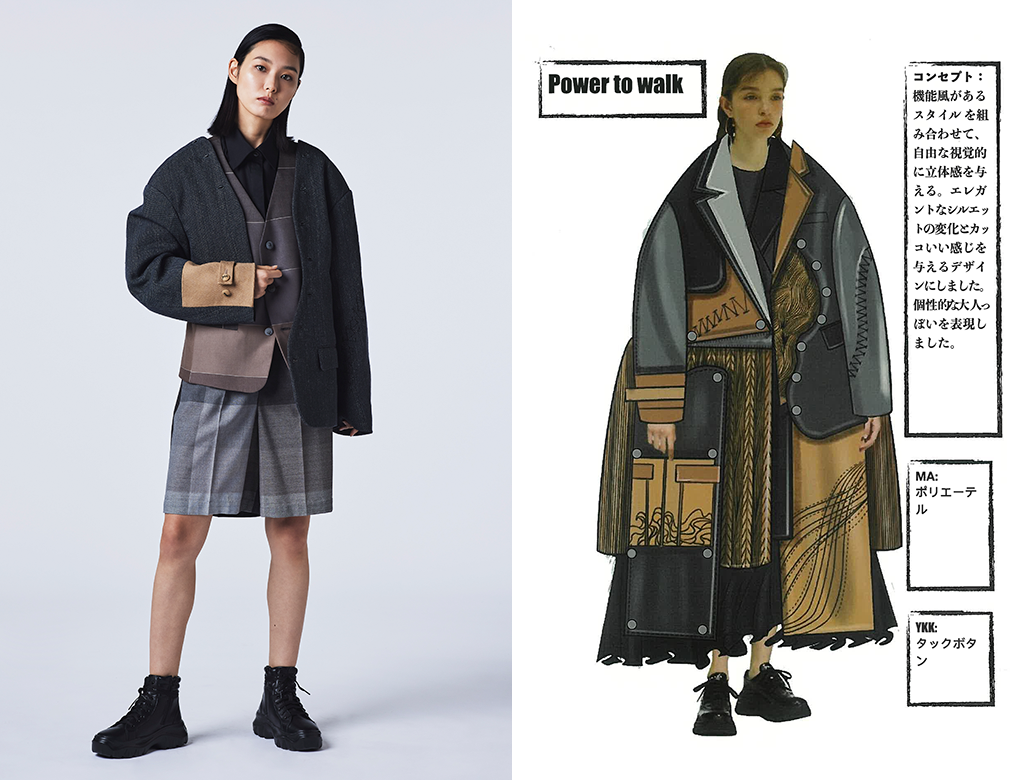 タックボタンを組み合わせて機能性の変化を持たせたスタイルを制作。エレガントなシルエットとメンズライクな雰囲気を与えるデザインにした。 |