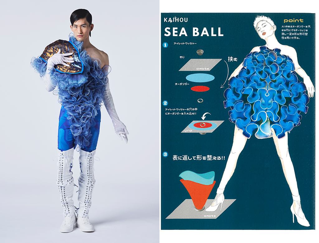 壮大な海に生息する海藻や生物と1980年代のボールカルチャーの生き方に強く繋がりを感じた。ウミウシや海藻などが持つ柔らかい流動性や個性ある色、形。それらとランウェイを華やかに歩く男性像を重ね合わせ、内側から溢れる美をアイレットワッシャーで表現。 |