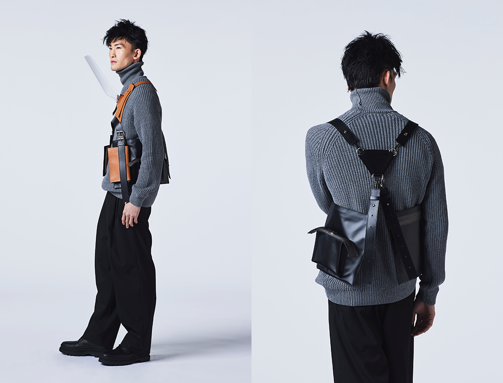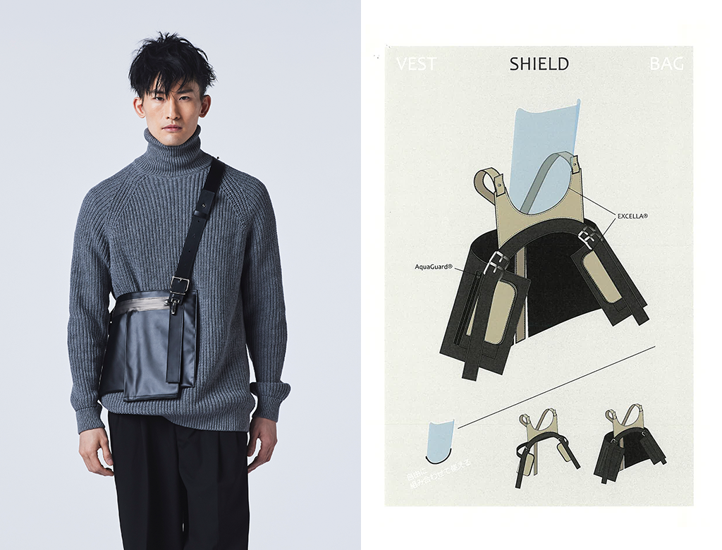 新型コロナウイルスの影響で新たなルールが作られ、生活が見直されている。そこから着想を得てこのアイテムをデザインした。フェイスシールド、チェストバッグ、ベスト、フォンホルダーを再構築した、日常の様々なニーズに応じて組み合わせられるファッションアイテム。 |