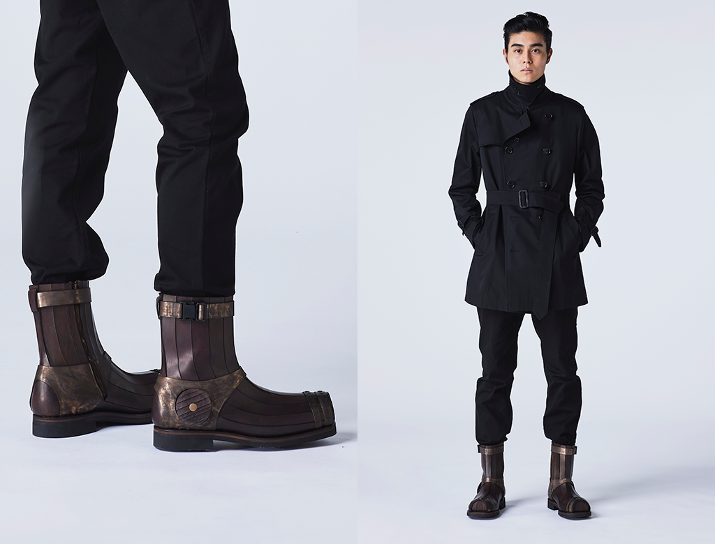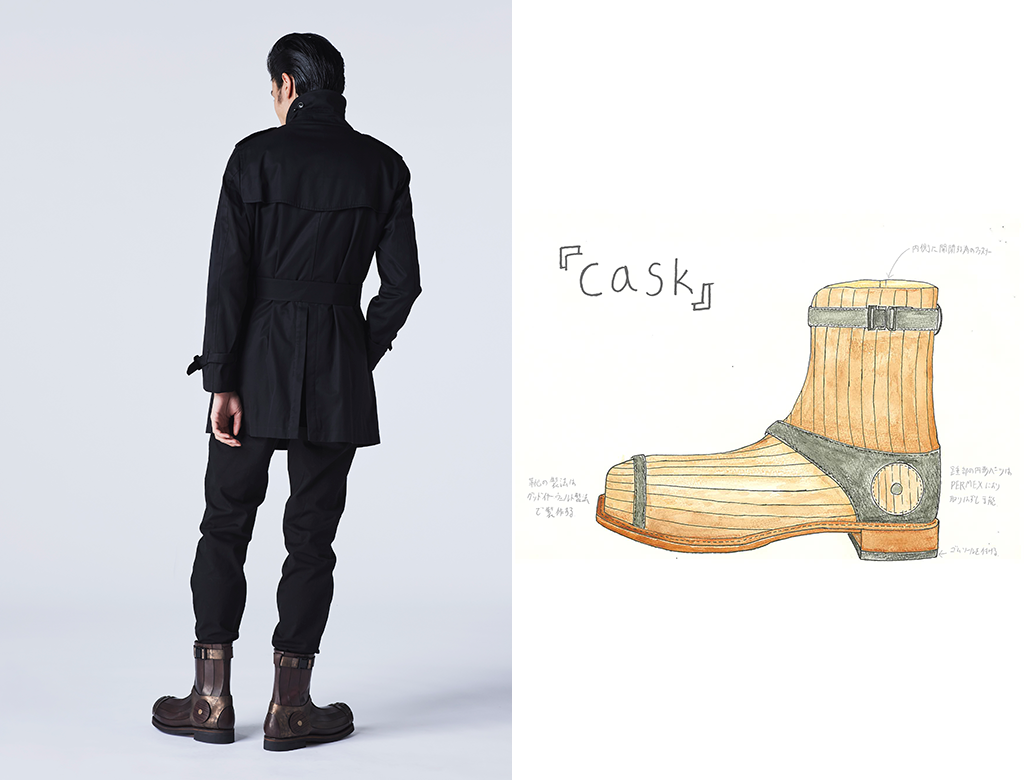 古来より人は、物を樽に詰めて保存してきた。ウイスキーもそのうちの一つである。ウイスキーは長期に渡って樽の中で眠り熟成するが、その熟成には数多の種類の樽が使用される。長年使用された樽の持つ風合いと曲線美を「グッドイヤーウェルト製法」という伝統的な靴の製法で表現した。 |