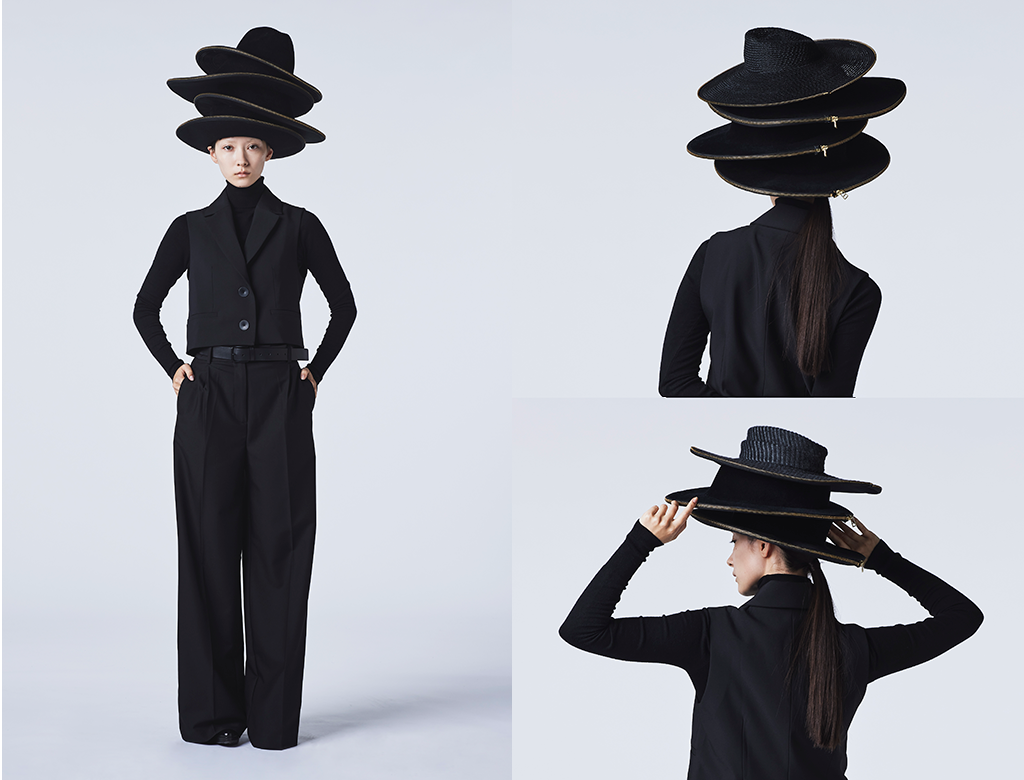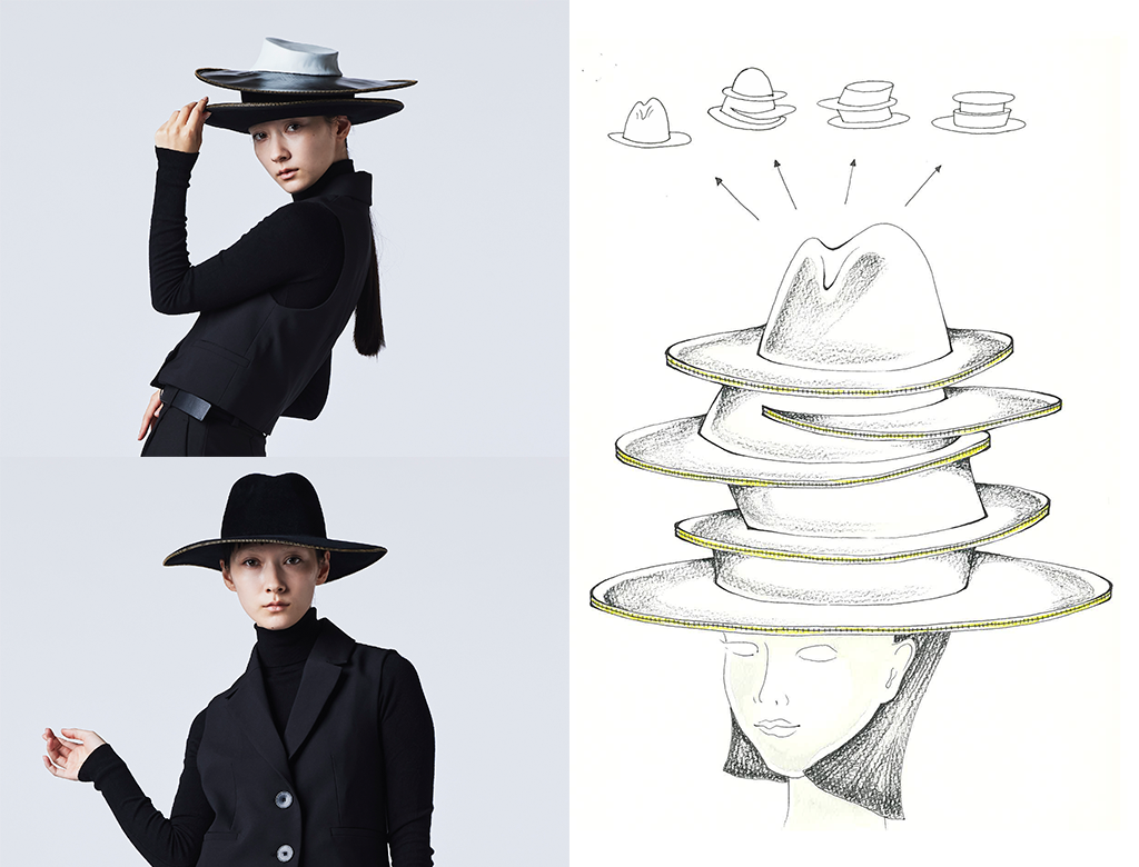 カメラのシャッタースピードを落として街を写すと写真には何本もの光の線が走る。ビルや道路、人々がその光に切り裂かれるようで、新しい表情を見せる。帽子も同じように金属ファスナーによって切り裂いて別々にかぶることができるように考えた。 |