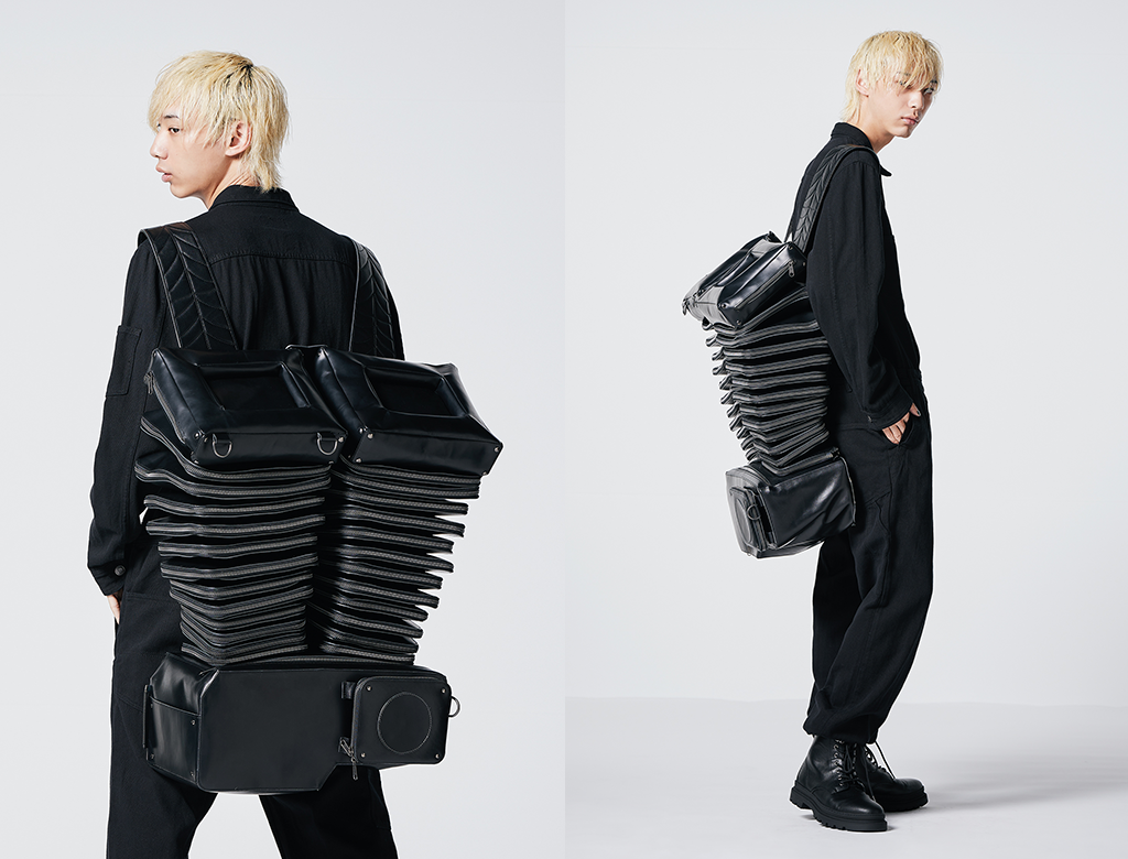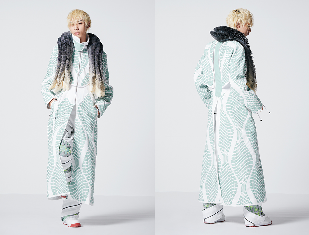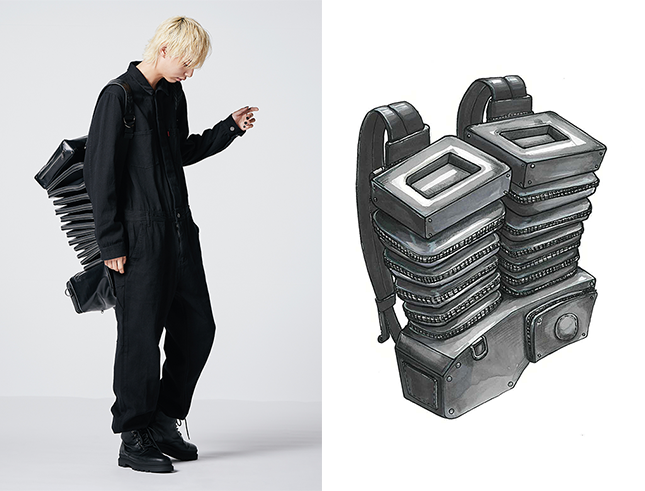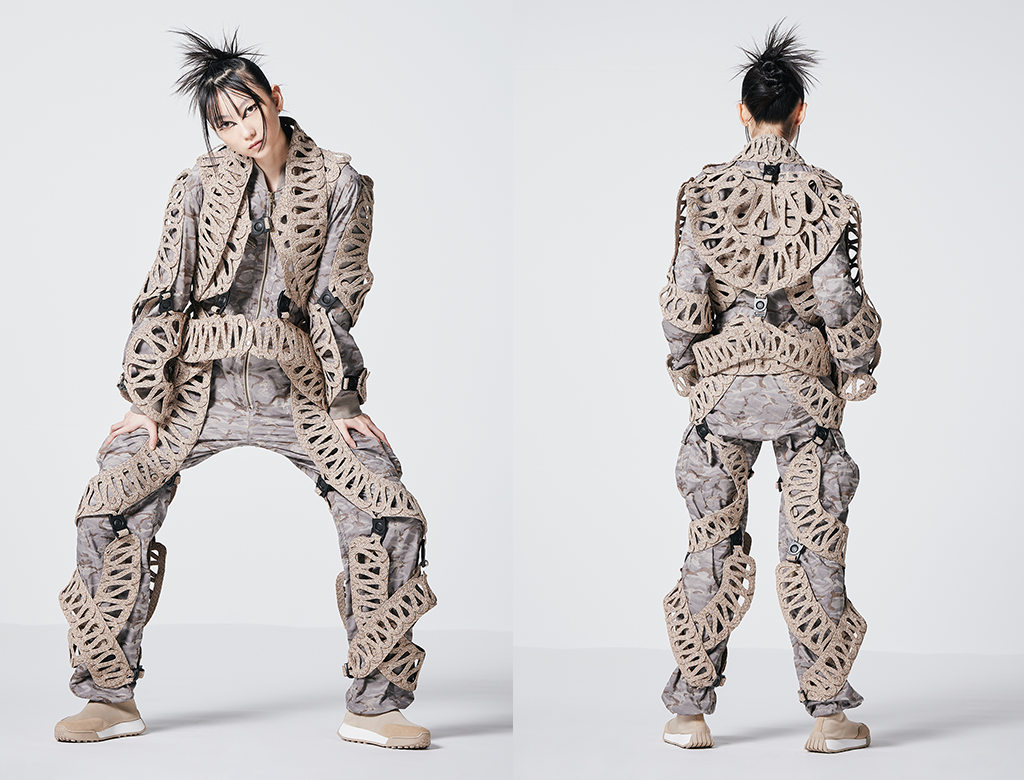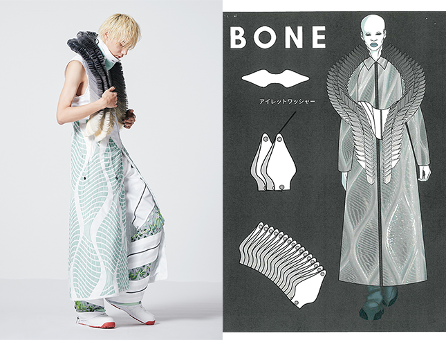 数多くのアイレットワッシャーを使用し、人体の脊髄を表現したアートピースを製作。また、コートやパンツにも人が動くために必要な機能性を出すためにファスナーとアイレットワッシャーを使用し、人体の形態美を服に落とし込んだ作品。 |