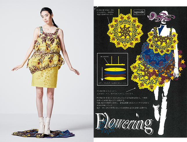 衣服を持ち上げることで平面的な形から立体的な衣服へと変化する。PLANCER® でパーツ同士を繋げることで組み合わせが何通りもある自由な衣服になる。その変化がまるで花が開花した瞬間のような美しさや幻想的なイメージを生み出していく。 |