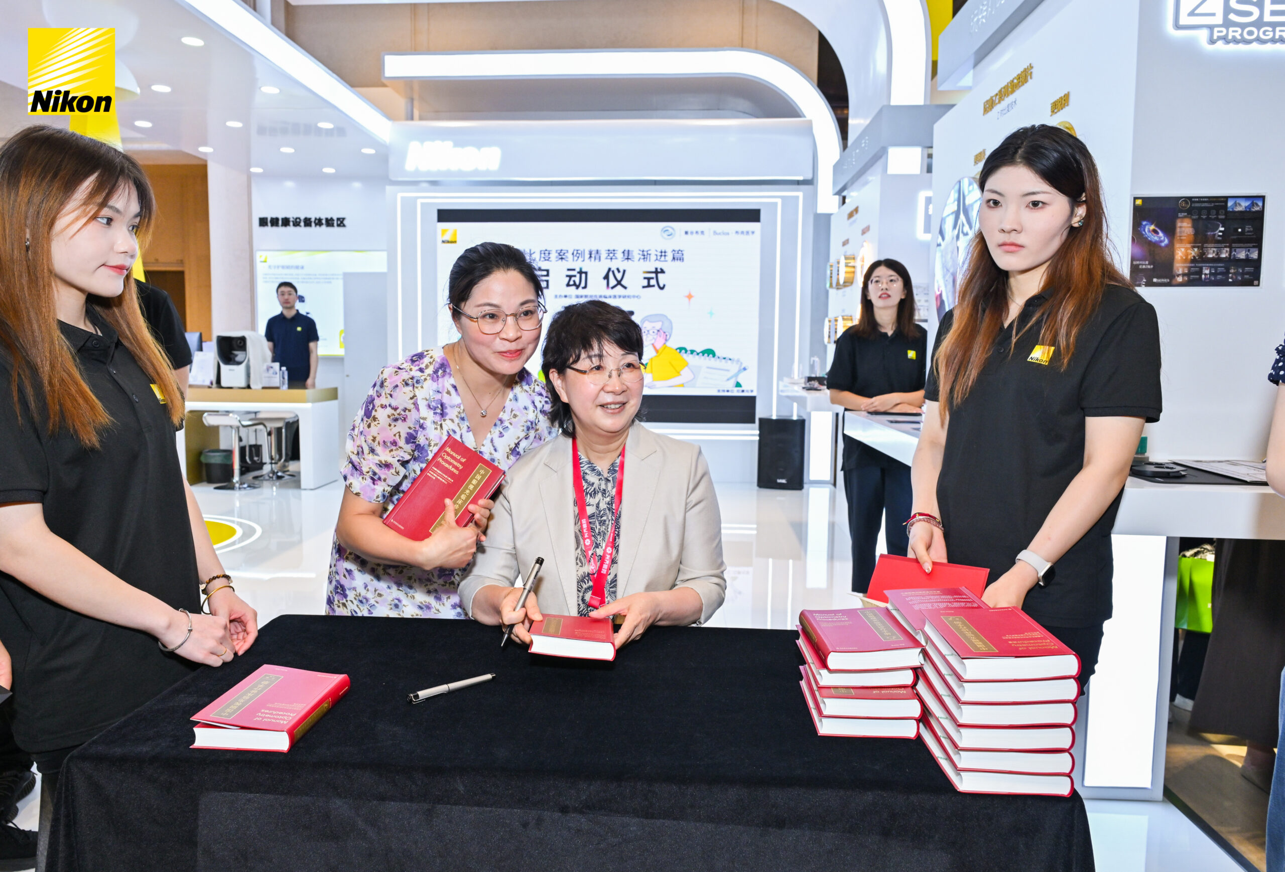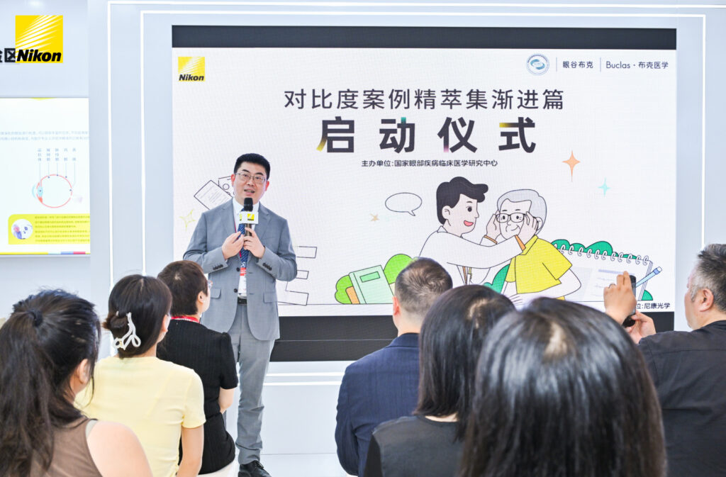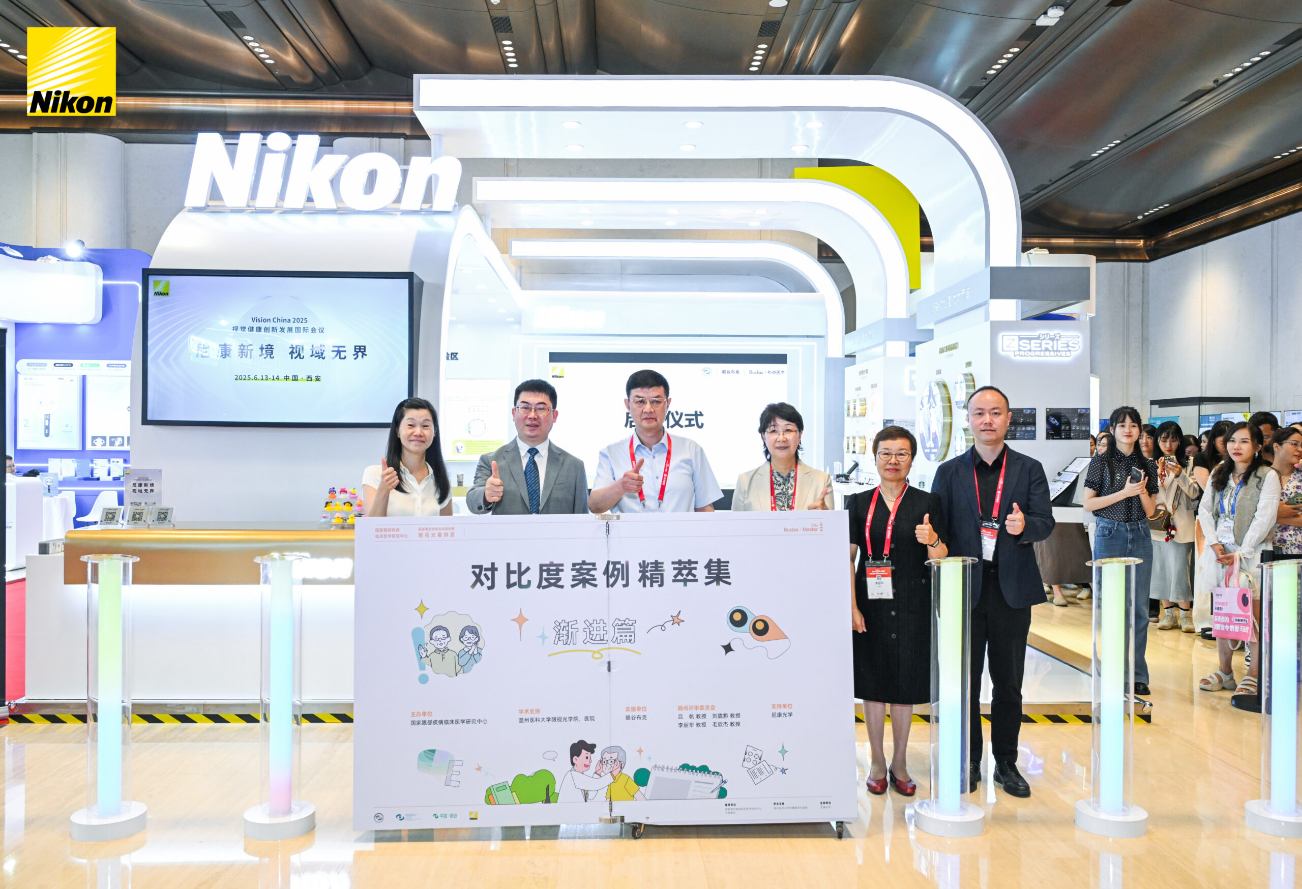 6月14日,尼康展台举行“对比度案例精萃集-渐进篇”项目启动仪式。该项目由国家眼部疾病临床医学研究中心发起,布克医学承办,尼康光学支持,旨在提升老年渐进镜验配专业水平,促进行业交流与技能提升。众多业内专家齐聚:国家眼部疾病临床医学中心主任吕帆教授、四川大学华西医院眼科学科主任刘陇黔教授、天津市眼科医院视光中心主任李丽华教授、温州医科大学附属眼视光医院视光诊疗中心主任毛欣杰教授、温州医科大学附属眼视光医院教育教学部主任袁一民教授以及尼康光学中国 CEO Adeline女士等嘉宾共同登台,举行亮灯仪式,正式开启了这一重要项目。